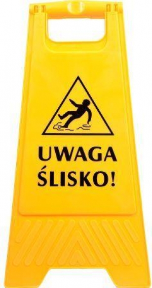 Tablica (potykacz) ostrzegawcza "Uwaga Ślizko" w kolorze żółtym. Wykonana z mocnego plastiku. Używana wszędzie tam, gdzie istnieje możliwość poślizgnięcia na mokrej posadzce.